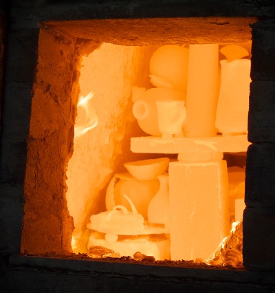 The pots inside the Anagama kiln. The wood ash melts on the pots forming the distinctive glaze.